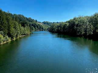 So ist das Geläuf recht wechselhaft: Breite, bequem zu laufende Schotter-Uferwege, abgelöst durch unbefestigte, regenzerfurchte, steil Berg auf und ab - hoch konzentriert zu absolvierende - Off-Road-Abschnitte, sich anschließende schattige, federnde Waldwege sowie verwunschene Wildpfade im Biberland und eine von der heißen Sonne unter tiefblauem Himmel gegeißelte einsame Teerstraßen, die an diesem Tage für den Autoverkehr gesperrt zu sein scheint. Tatsächlich begegne ich dort nur Radfahrern und an einer Hand zählbare Autos.